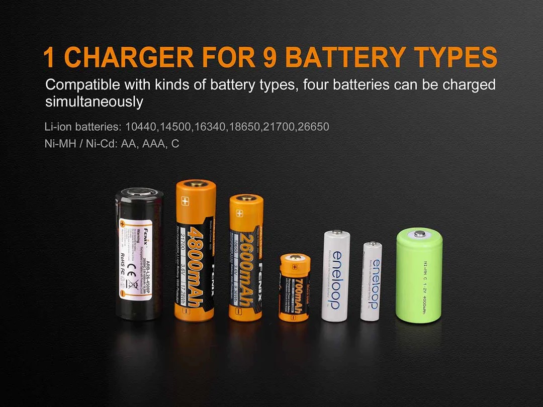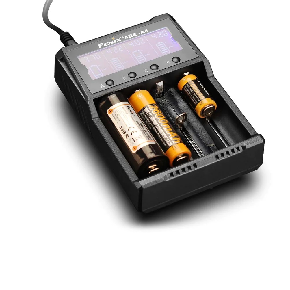 Fenix ​​ARE-A4 е четириканално интелигентно зарядно устройство, създадено за различни типове и различни размери акумулаторни батерии. Зарядното устройство автоматично ще избере правилния режим на зареждане за всеки тип батерия, независимо дали е Li-ion, Ni-MH или Ni-Cd. LCD екранът с висока разделителна способност показва състоянието на зареждане и нивата на батерията. Вградената многофункционална защита гарантира безопасността на зареждането. Зарядното устройство също така включва множество вградени вериги за защита, които предпазват от късо съединение, свръх ток, свръхнапрежение и обратен поляритет.