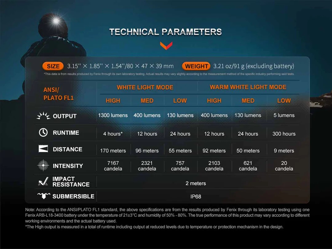 Челникът разполага с два диода, които се управляват независимо – един със студено бяла 6500K светлина за по-дълги разстояния, а другият с много топла 3000K светлина за по-добра работа при мъгла и лоши метеорологични условия наблизо. Включете и двата диода едновременно за комбинирана максимална мощност от 1500 лумена.
