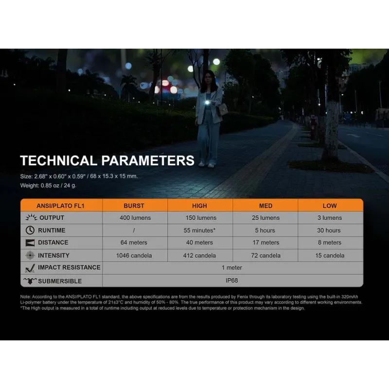 Фенерчето с ключодържател Fenix ​​E05R е страхотно, и можете да го носите всеки ден. С дължина 68 мм и диаметър 15 мм, това фенерче тежи само 24 грама и е идеално за ключодържател, джоб или чанта. Четирите нива на яркост са достъпни чрез натискане на страничния бутон, а когато имате нужда от допълнителна мощност, задръжте бутона натиснат за турбо режим с  400 лумена. Вградената батерия може да се зарежда бързо чрез отвиване на главата, за да се открие микро-USB портът за зареждане. Създаден за всяка ситуация, фенерчето с ключодържател Fenix ​​E05R е издръжливо, устойчиво на удари, прах и вода. Доверете се на това мини фенерче за ежедневните си нужди.