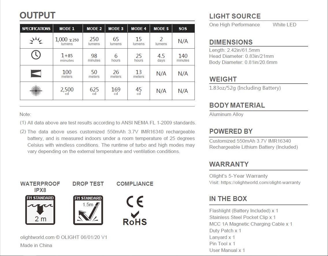 Мултифункционално, презареждаемо фенерче-челник с максимална сила на светене 1000lm с неутрална светлина и далекобойност до 100м. Снабдено с магнит в задната си част за прикрепяне, към метални повърхности, щипка и специален пач за прикрепяне, към велкро панели. Поставено в пача, фенерчето може да бъде регулирано под ъгъл в рамките на 60 градуса. В комплект зарядно устройство, към USB Olight MCC1A.