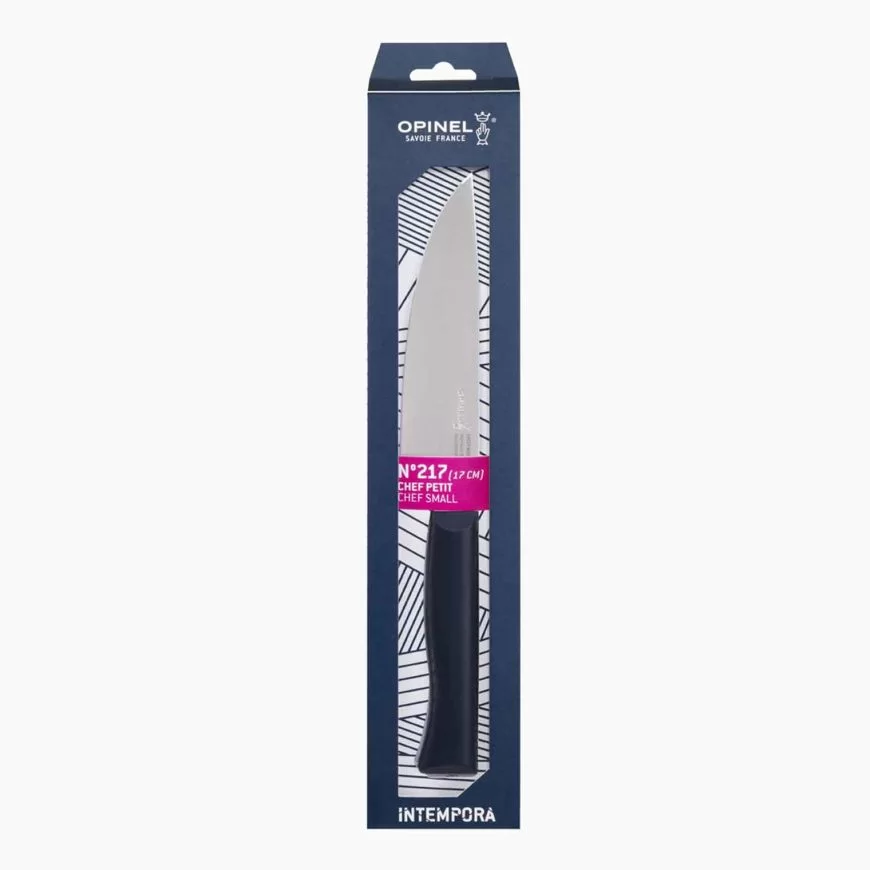 Ножът Opinel N°217 Small Chief Intempora 12C27 е кухненски нож, който поради формата на ръкохватката може да ви напомни на известните джобни ножове Opinel. Това е приличен нож, с който можете да работите ефективно. Стилната пластмасова ръкохватка изработена от полиоксиметилен или накратко POM. Това е здрав вид пластмаса, която е подсилена със стъклени влакна. Това прави ножовете устойчиви на удари и топлина. Острието е изработено от шведската стомана Sandvik 12C27.
