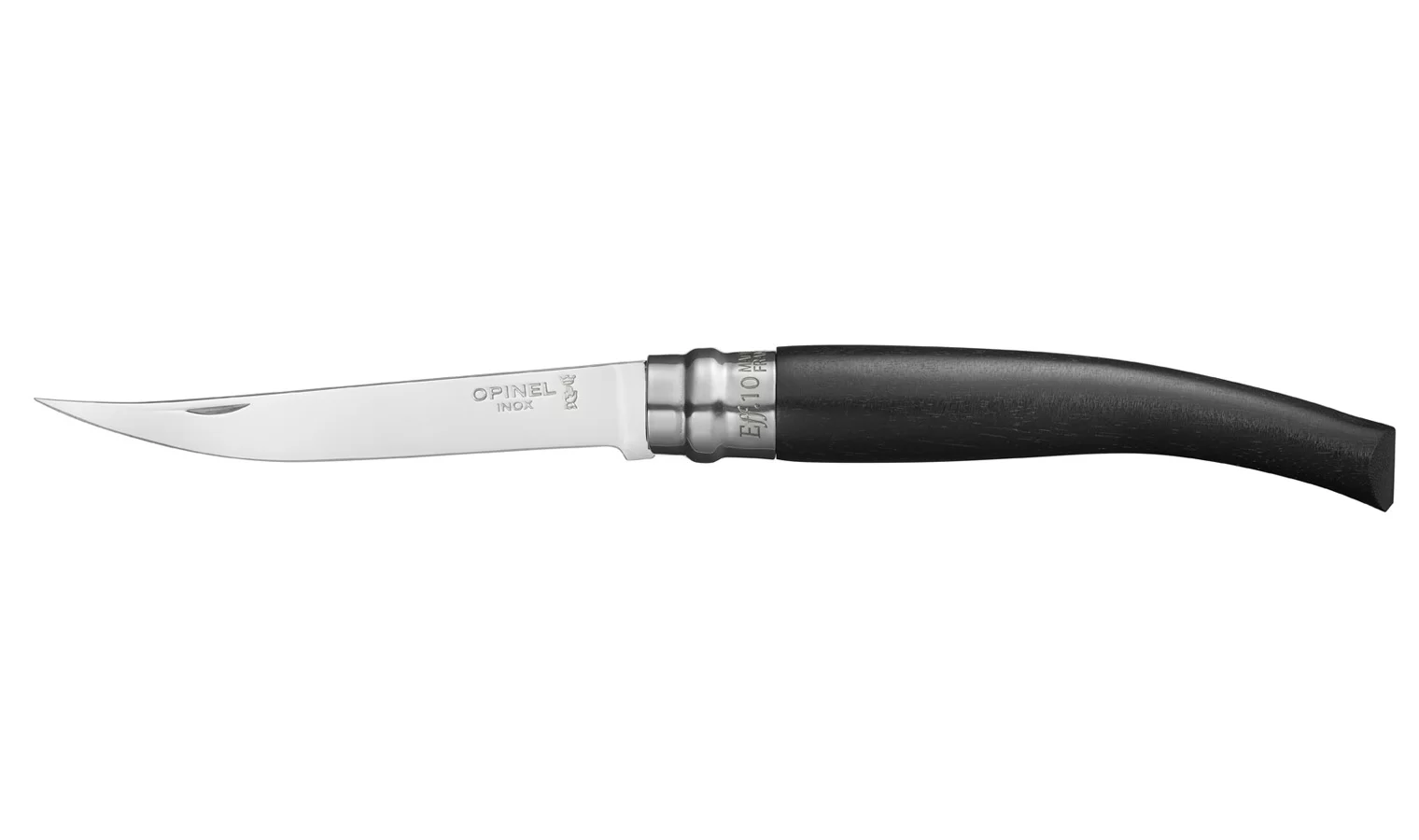 Ножът Opinel Les Effiles No 10 е производство на Френската фирма Opinel, която е със 120 годишна история и се е превърнала в символ на френската култура и традиции. Първият Оpinel е създаден през 1890 г. от Жозеф Опинел, тогава той е на 18 години и работи във фамилната работилница за изработка на сечива. Ножът бързо спечелил популярност сред местните фермери, скотовъдци и лозари със своята лекота и здравина. Тази популярност скоро напуснала пределите на провинция Савой, а в днешно време и на Франция. Този модел Opinel No 10 е с острие от полирана неръждаема стомана 10 см, дръжката му е изработена от абаносово дърво. Ножът разполага с Viroblock система за заключване на острието в отворено и в сгънато положение с цел безопасност при употреба или съхранение. Идва в подаръчна картонена кутия.