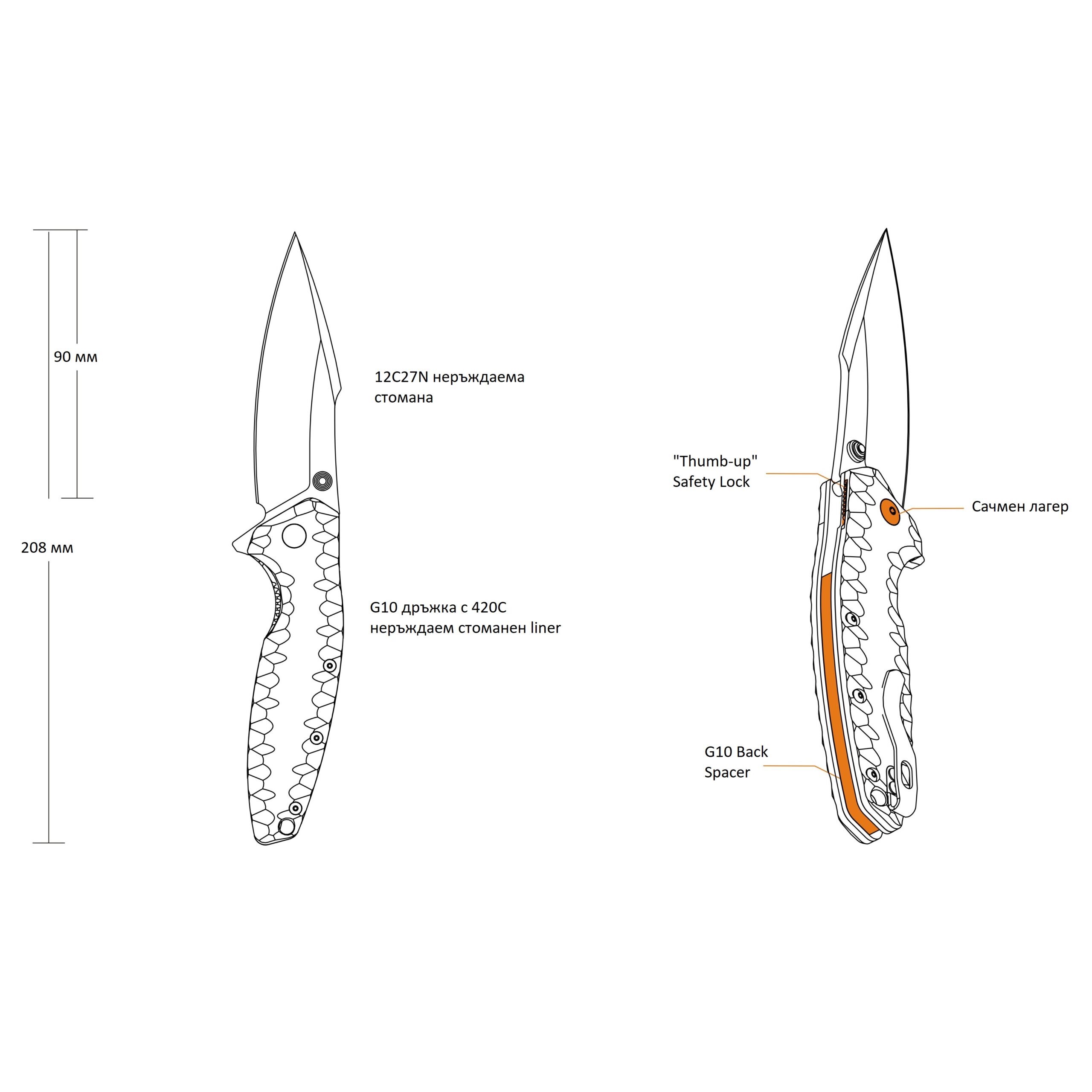 Тъй като е плоско, извито, за да предложи дълъг корем и заостреност, за да образува фин връх, острието на P843 е идеално за рязане. Освен това предпазната брава „Thump Up“ гарантира, че ножът е надежден и винаги контролиран.