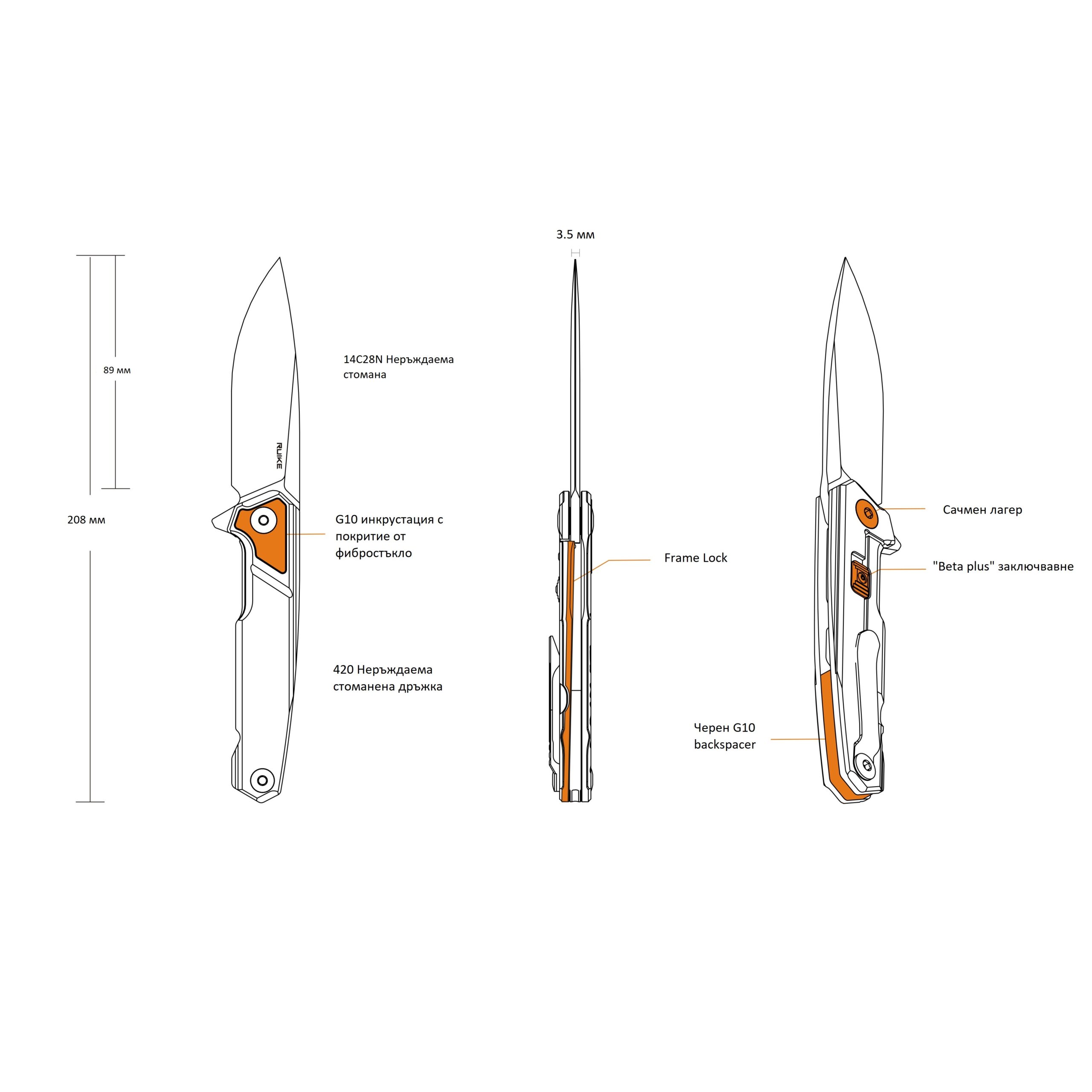 Ruike P875-SZ е предназначен за клиенти, които предпочитат острие 14C28N и дръжка от стомана 420. Дръжката на P875 е фино гравирана с орлови нокти. Самото цвете традиционно се счита за символ на добри пожелания, а гравираният дизайн помага на потребителите да държат здраво. P875 също се предлага с нашата предпазна ключалка BetaPlus, предотвратявайки неволно затваряне на острието.
