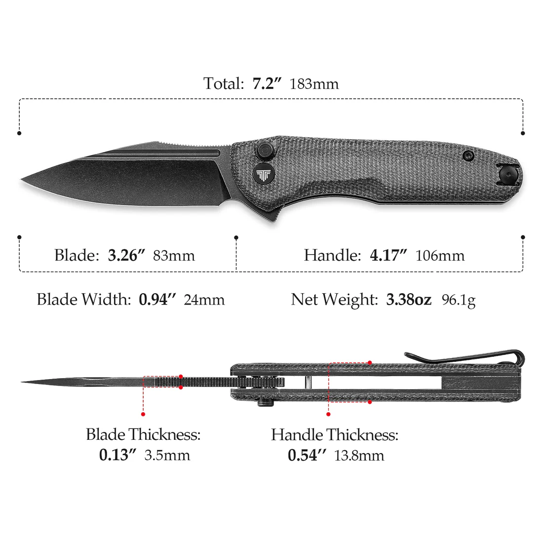 Сгъваемият нож Trivisa Antliae е изработен от неръждаема стомана Sandvik 14C28N, известна със своята издръжливост и способност за лесно заточване, острието му има дължина 83 мм и дебелина 3,5 мм за стабилност при работа, дръжката е изработена от микарта, материал, който предлага здравина, стабилност и приятен захват, керамичните лагери в механизма на ножа гарантират плавно и бързо отваряне, докато заключващият механизъм Button Lock осигурява сигурност при използване, общата дължина на ножа е 183 мм, а теглото му е около 96.5 г, което го прави удобен за носене и употреба