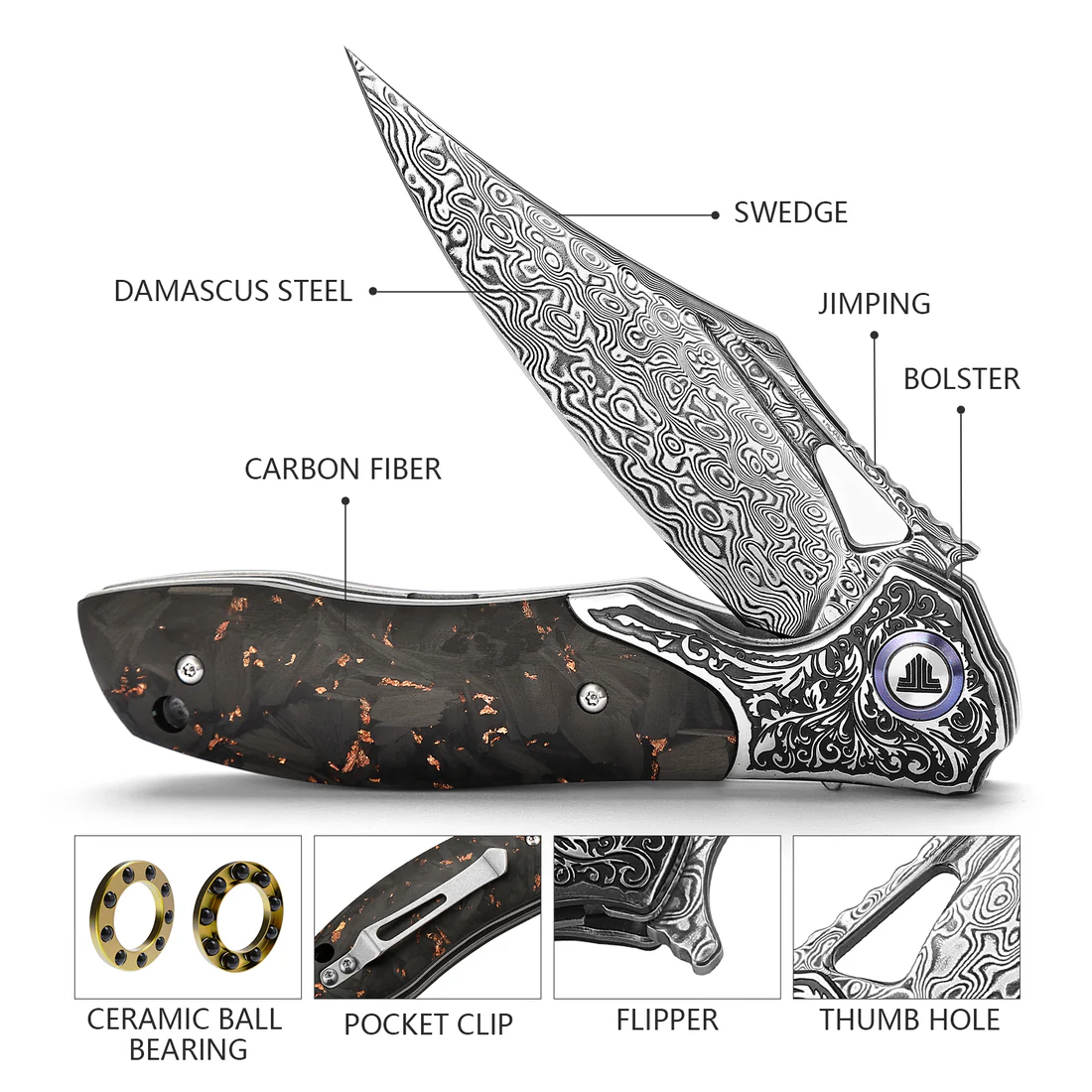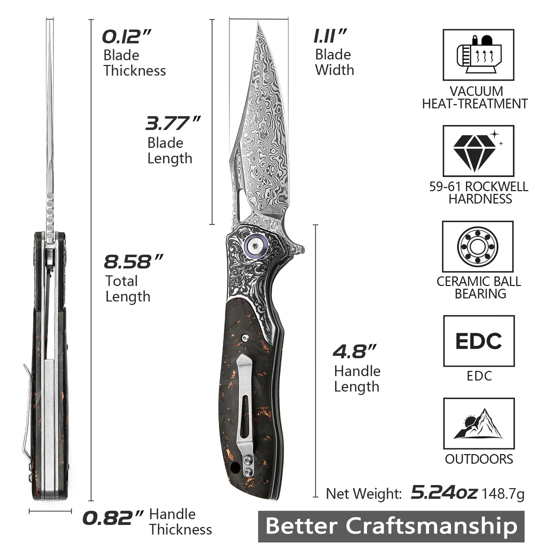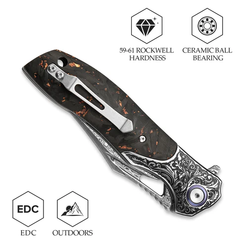 Сгъваемият нож Trivisa Apus е изработен с внимание към детайла, използвайки висококачествени материали. Острие от дамаска стомана с 110 слоя осигурява изключителна острота и издръжливост. Дръжката комбинира стомана и въглеродни влакна, съчетавайки здравина с лекота и елегантен дизайн. Механизмът на заключване Liner Lock гарантира безопасност при употреба. Керамичните лагери осигуряват плавно и лесно отваряне на острието. Общата дължина на ножа е 218 мм, а теглото му е около 148.7 гр, което го прави удобен за носене и ежедневна употреба.