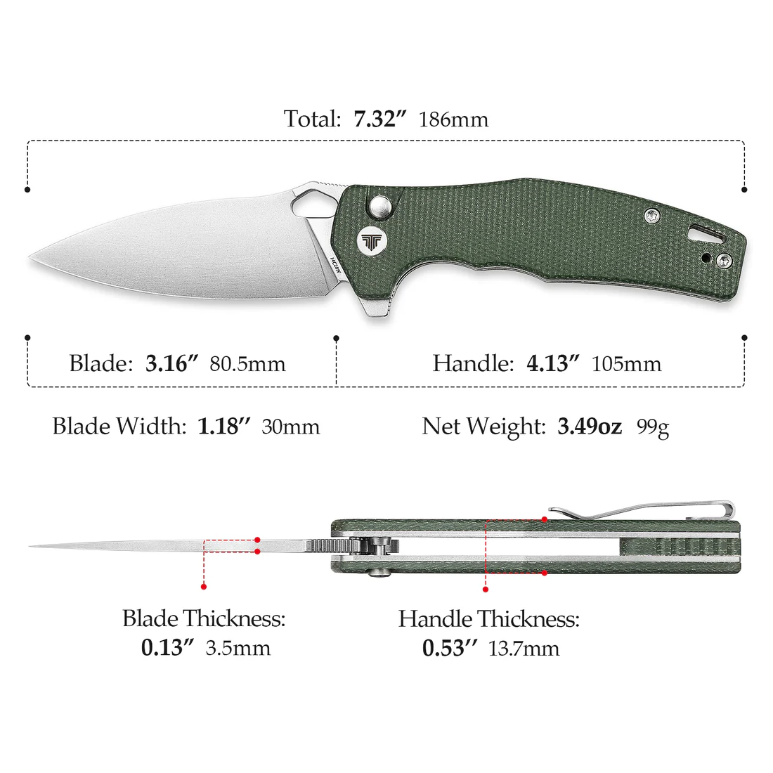 Сгъваемият нож Trivisa Corvus е компактен и лек инструмент създаден за ежедневна употреба острието му е изработено от стомана Sandvik 14C28N с дължина 80 мм и дебелина 3,5 мм осигуряващи отлична острота и издръжливост дръжката е изработена от Micarta материал известен със своята здравина и лекота предоставяйки сигурен захват и комфорт при употреба механизмът на заключване е Button Lock който гарантира безопасност по време на работа керамичните сачмени лагери в механизма осигуряват плавно и бързо отваряне на острието общата дължина на ножа е 186 мм, а теглото му е около 99 г, което го прави удобен за носене и ежедневна употреба.