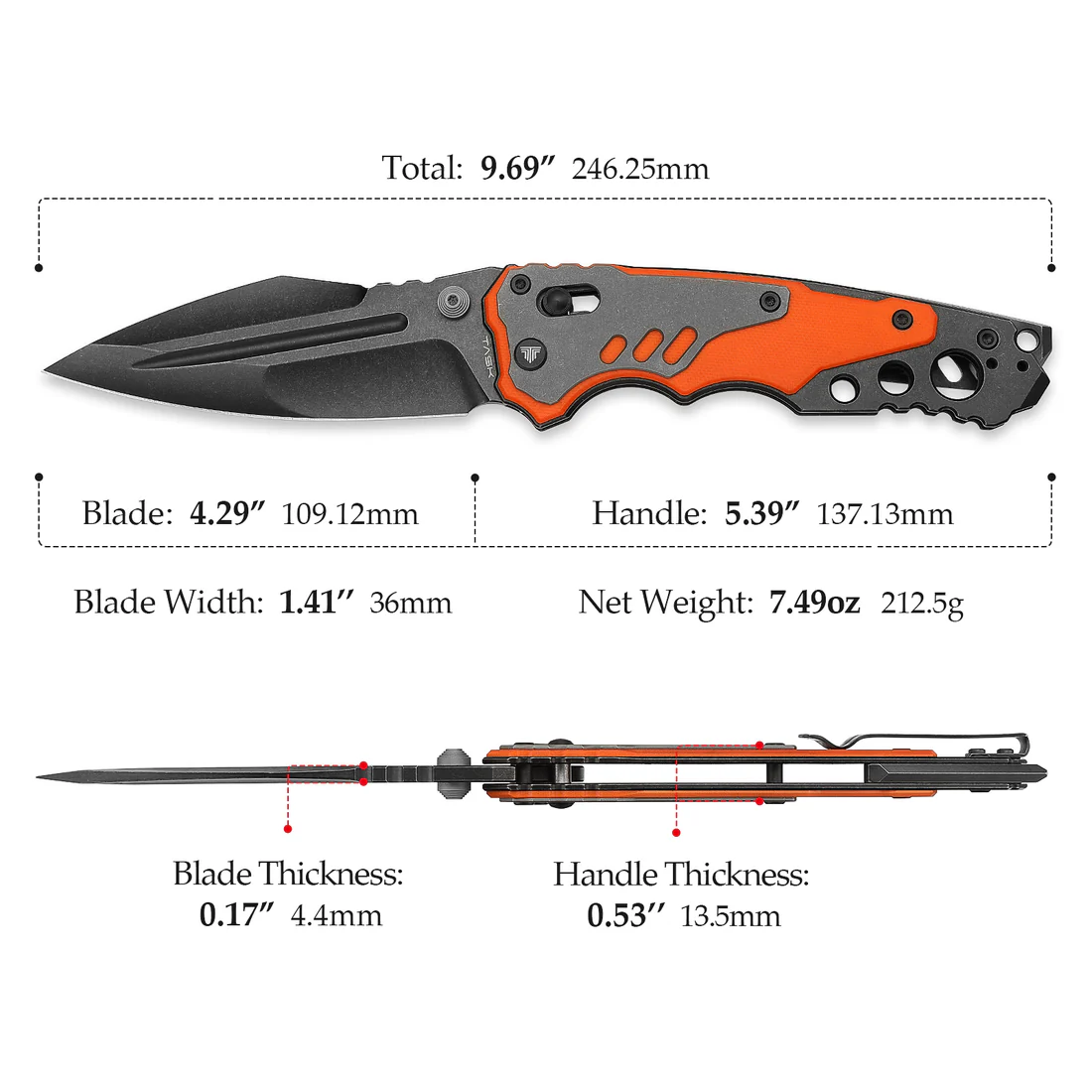 Дръжката на Tivisa Intruder е съчетание от титан и G10, което осигурява перфектен баланс между здравина, лекота и комфорт. Титанът е известен със своята изключителна издръжливост и устойчивост на корозия, докато G10 е лек, здрав и предлага отлично сцепление, дори в мокри условия. Тази комбинация от материали прави дръжката не само изключително здрава, но и много удобна за продължителна работа.