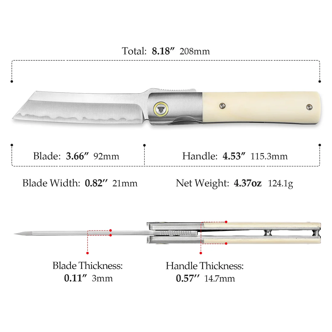 Дръжката на ножа е от кост с титаниева опора, осигуряваща здравина, стабилност и комфорт при употреба. Tivisa Kira използва механизъм за заключване Liner Lock, който гарантира безопасност и предотвратява случайно затваряне на острието. Керамичните лагери осигуряват плавно и лесно отваряне, намалявайки износването и удължавайки живота на ножа.