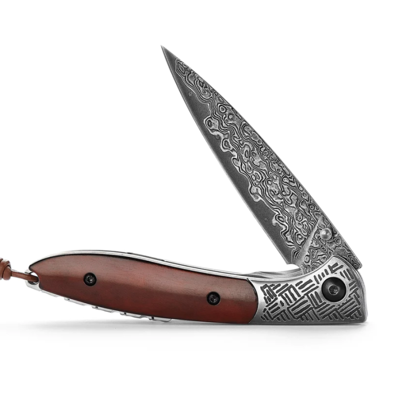 Острието е изковано по традиционната сан-май (san-mai) техника – трислойна структура, в която твърда сърцевина от 10Cr15CoMoV стомана е обгърната от 67 слоя дамаскова стомана. Това придава на ножа не само поразителен визуален ефект, но и отличен баланс между здравина, устойчивост на корозия и изключителна острота.