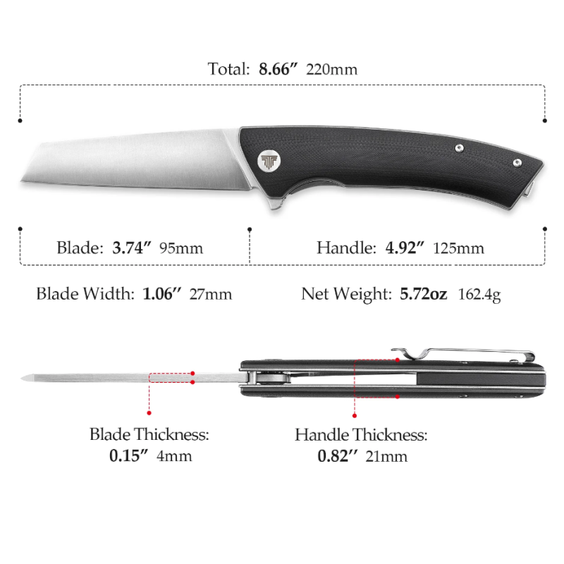 Trivisa Sag-03B е много удобно ножче за ежедневно ползване както в града, така и на излет. За неговата здравина отговарят острието от стомана D2, ръкохватката от G10 и сачмен лагер, а заточването тип Convex го прави доста остро. Прекрасно ножче, идеално като подарък за всеки любител на сгъваемите остриета.