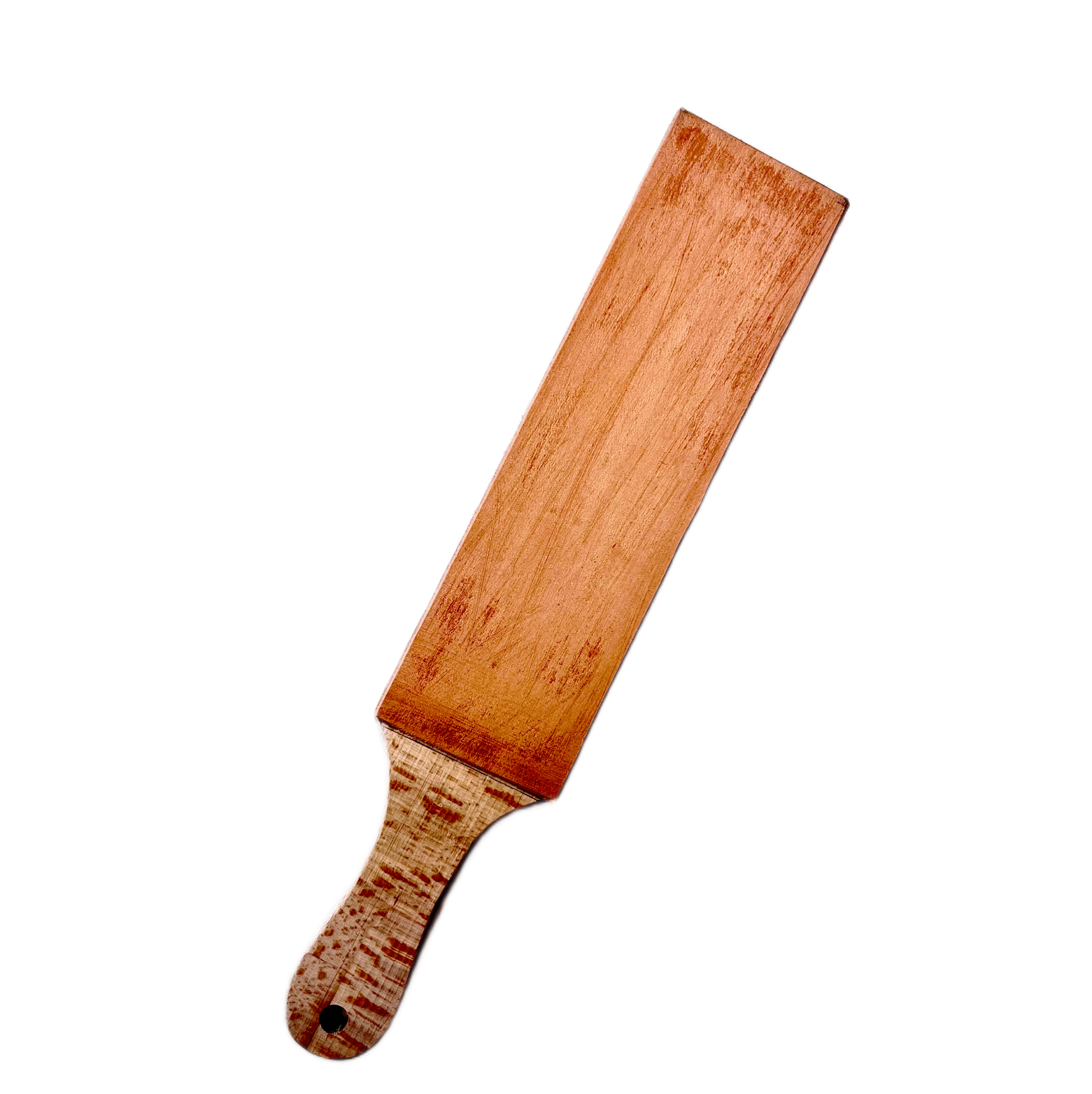 Ръчно изработен строп с дръжка за удобен захват и двойна кожа – телешка кожа за използване с паста и здрава кожа от кенгуру, която не изисква паста. Идеален за ефективно и дълготрайно поддържане на остриета.
