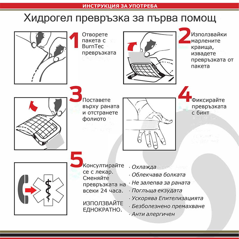 Модерна хидрогелна превръзка, предназначена за първа помощ при изгаряния от първа, втора и трета степен – термични, химически и електрически. Усилена с медицински нетъкан текстил, който осигурява стабилност, без риск от разливане на охлаждащия гел.