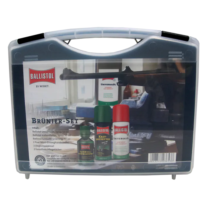 Комплект за оксидиране Klever Quick-Browning-Kit в кутия BALLISTOL е удобен и ефективен набор за бързо и лесно оксидиране на метални повърхности, предназначен да възстановява оригиналния външен вид на оръжията и други метални изделия. Комплектът включва всички необходими продукти и инструменти за постигане на качествено оксидиране, което осигурява защита срещу ръжда и корозия, както и естетичен, матов завършек.