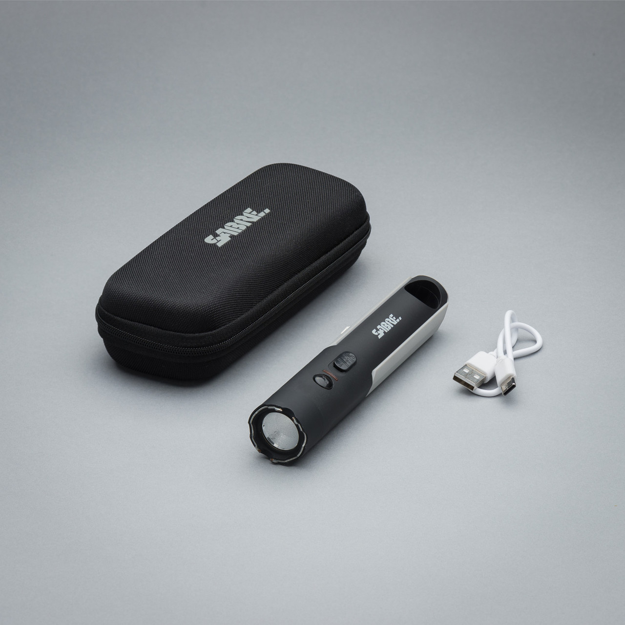 Електрошокът на Sabre S-1014  е със заряд от 1,75 µC с изключително спираща сила. Яркото LED фенерче с 200 лумена предлага три режима на работа – високо, средно и пресветкане. За максимално удобство този електрошок включва в комплекта твърд калъф за безопассно съхранение и лесно пренасяне. Електрошокът е с вградена батерия и включва кабел за зареждане и индикатор заза нивото на батерията.